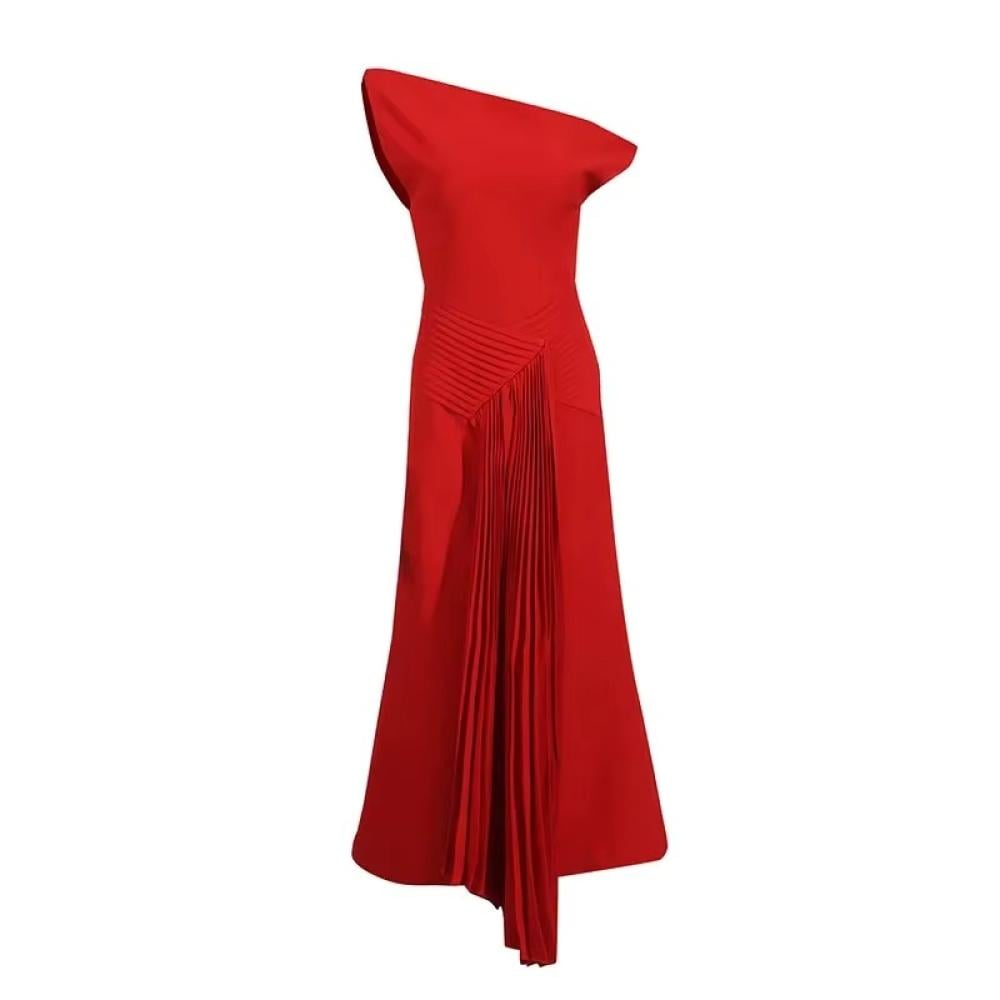أنيق فستان صيفي بنمط فرنسي كلاسيكي، يتميز بكتف غير متماثل وتنورة مطوية مصنوعة من القطن الناعم، متوفر بألوان وبمقاسات متعددة تناسب جميع الأذواق.