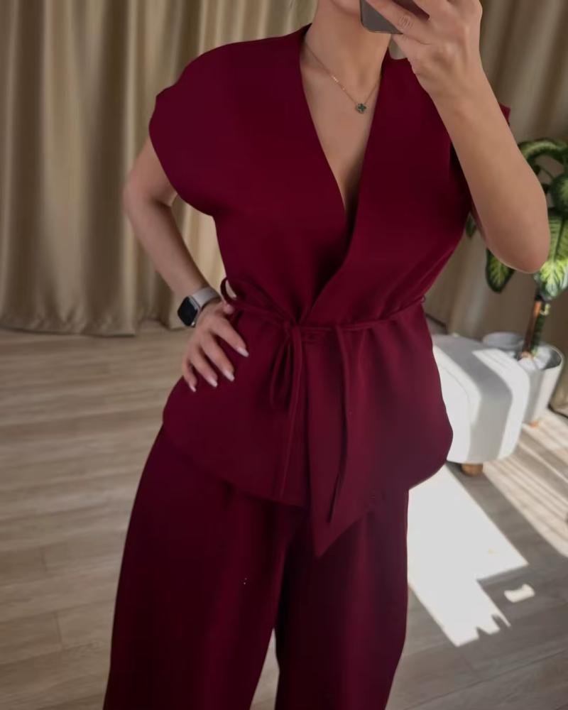 - الاسم: جديد أزياء المرأة بنطال ذو قصة أرجل واسعة مجموعات بلوزات بلا أكمام مع حزام